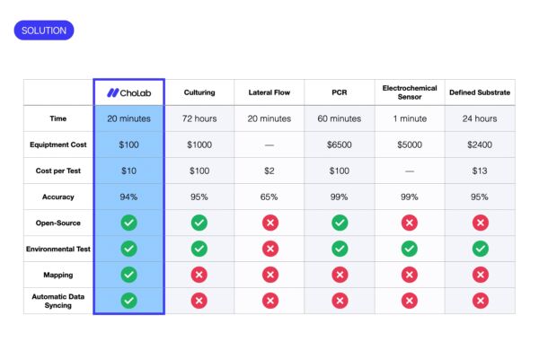 ChoLab brings real-time cholera detection to the frontlines of public health. Using a portable, low-cost device and a smartphone, it identifies contaminated water in just 20 minutes, removing the need for traditional laboratory facilities. Community health workers can respond immediately and upload test results to create a grassroots surveillance network. Public health agencies gain early warning of outbreaks, shifting response from reactive to proactive. Designed with local input, ChoLab empowers communities and supports stronger water safety and disease prevention