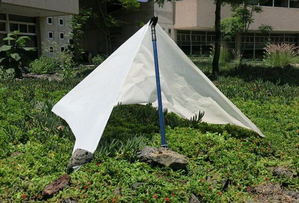 LighTent is a lightweight hiking pole with an integrated pop-up tent. Rolled inside the pole's shaft, the tent is easily removed and assembled. With the pole stabbed into the ground, the tent hooks over its handle, and anchors to the earth with pegs previously fastened to the pole's lower half. While retaining all of its typical functions, LighTent transforms the walking stick into a form of shelter.