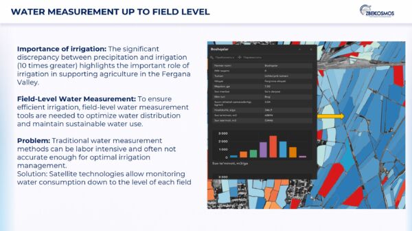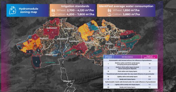 Combining satellite imagery, field data, and advanced analytics, this system monitors water use and improves irrigation efficiency in Uzbekistan’s Fergana region. By mapping over 17,000 km of canals and 312,000 hectares of farmland, it calculates crop water consumption and identifies areas of over- or under-irrigation. A dedicated geoportal provides real-time insights for farmers and policymakers, supporting better water planning, yield forecasting, and sustainable resource use in regions facing increasing water stress