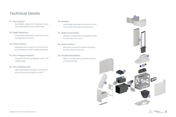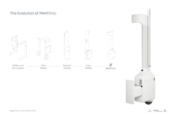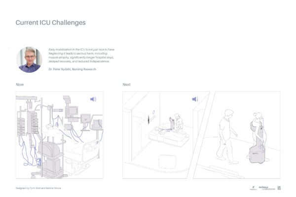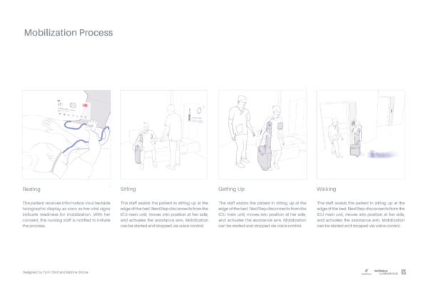 NextStep is a smart mobilisation system designed to enable early, safe mobilisation of intensive care patients. By integrating AI-assisted monitoring with physiologically adaptive support, it identifies clinically appropriate times for movement and temporarily takes over medical care during mobilisation. Floor projections and stabiliser sensors guide and monitor the patient, while personal audio options enhance comfort. NextStep reduces workload for clinical staff, encourages autonomy, and improves outcomes by embedding movement into routine ICU care