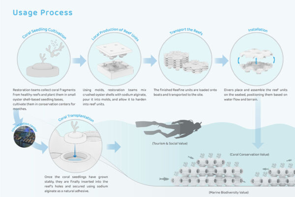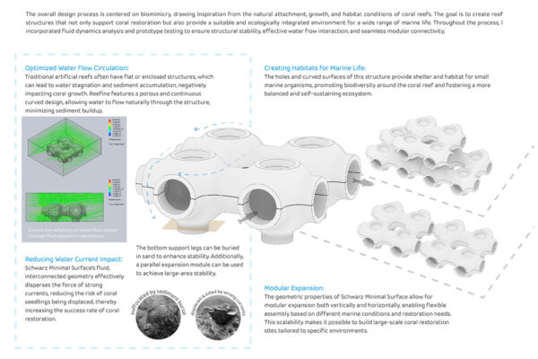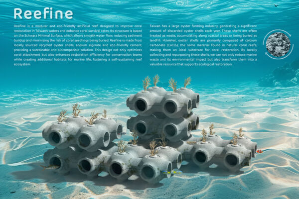 Reefine is a modular, biomimetic reef unit designed to improve coral restoration success. Using minimal surface geometry, it enhances water flow, stability, and sediment resistance. Made from recycled oyster shells and a zero-cement binder, the material supports coral calcification and marine attachment. Unlike 3D-printed structures, Reefine is locally cast using simple moulds, enabling low-cost, low-carbon production. This approach empowers coastal communities with an accessible, ecologically sound tool for rebuilding reef habitats and restoring marine biodiversity